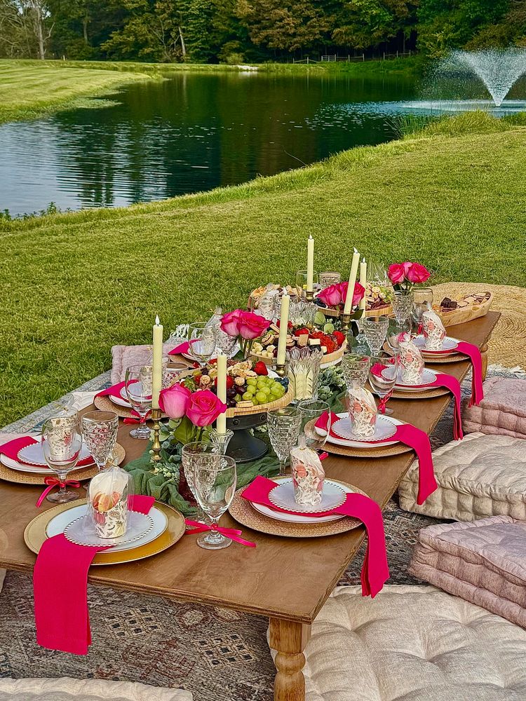 Each picnic includes a beautifully styled tablescape adorned with seasonal florals, soft ambient lighting, and plush pillows for seating. Guests will enjoy a rustic French loaf with seasoned olive oil for dipping, along with a chilled pitcher of fruit-infused water. Every detail is thoughtfully curated to bring elegance, comfort, and connection to your outdoor gathering.